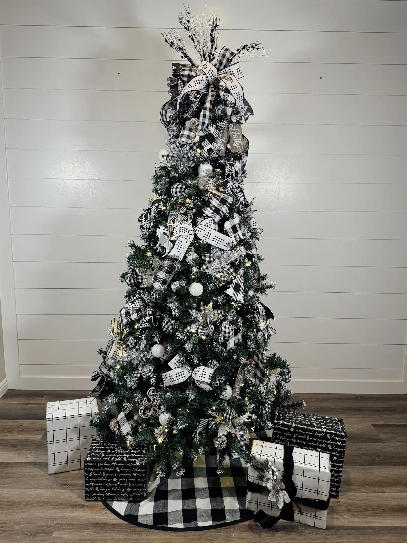 Designed with layers of black-and-white buffalo check, rustic wood accents, frosted pinecones, and sparkling silver touches, this tree brings an elevated farmhouse charm into any home or space.