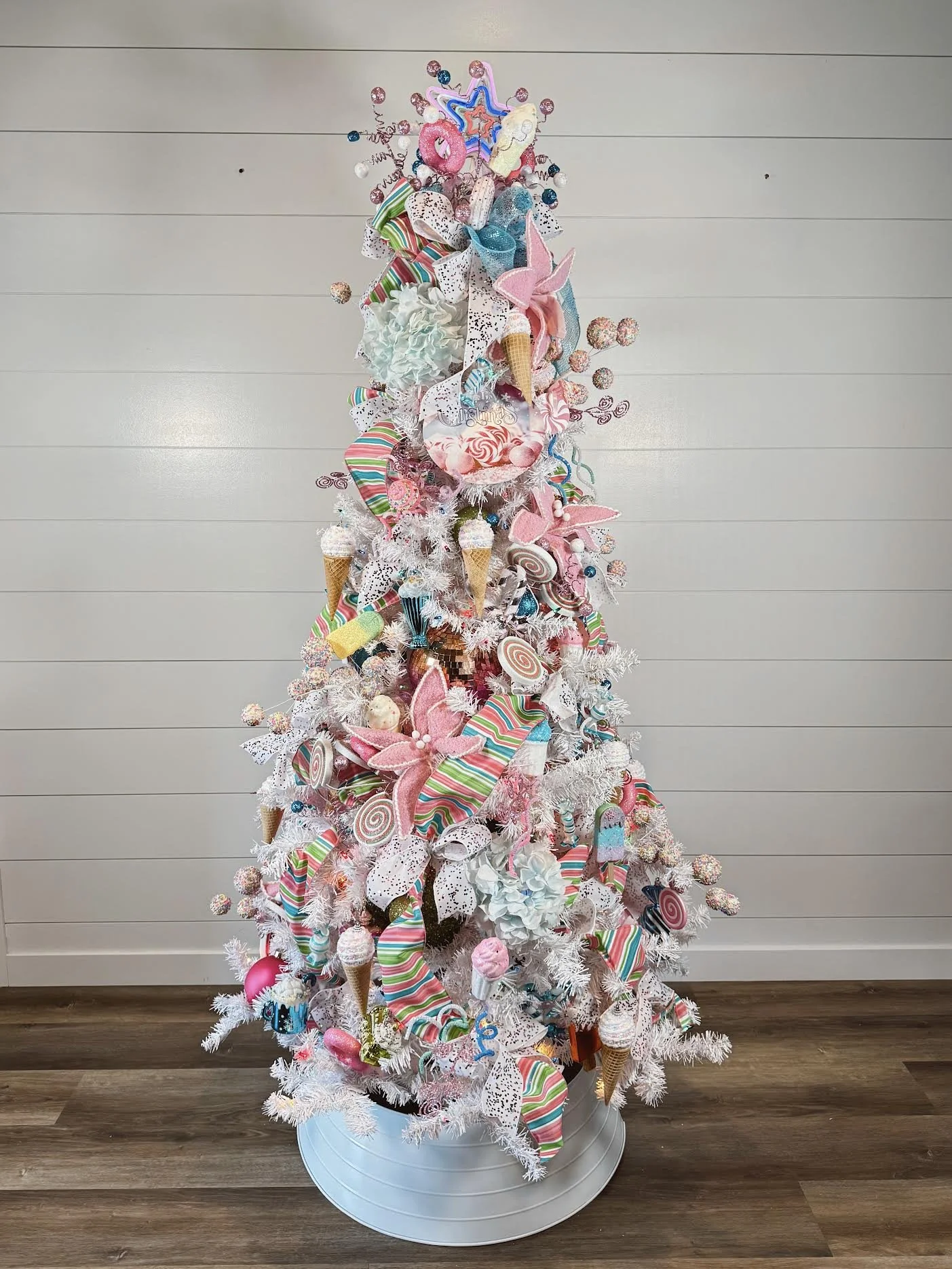 From glittering ice cream cones and lollipop swirls to cupcake ornaments and striped ribbons that look good enough to eat, every inch of this tree bursts with holiday cheer. Set against a crisp white base, it captures the magic of childhood nostalgia with a modern, Instagram-worthy twist.