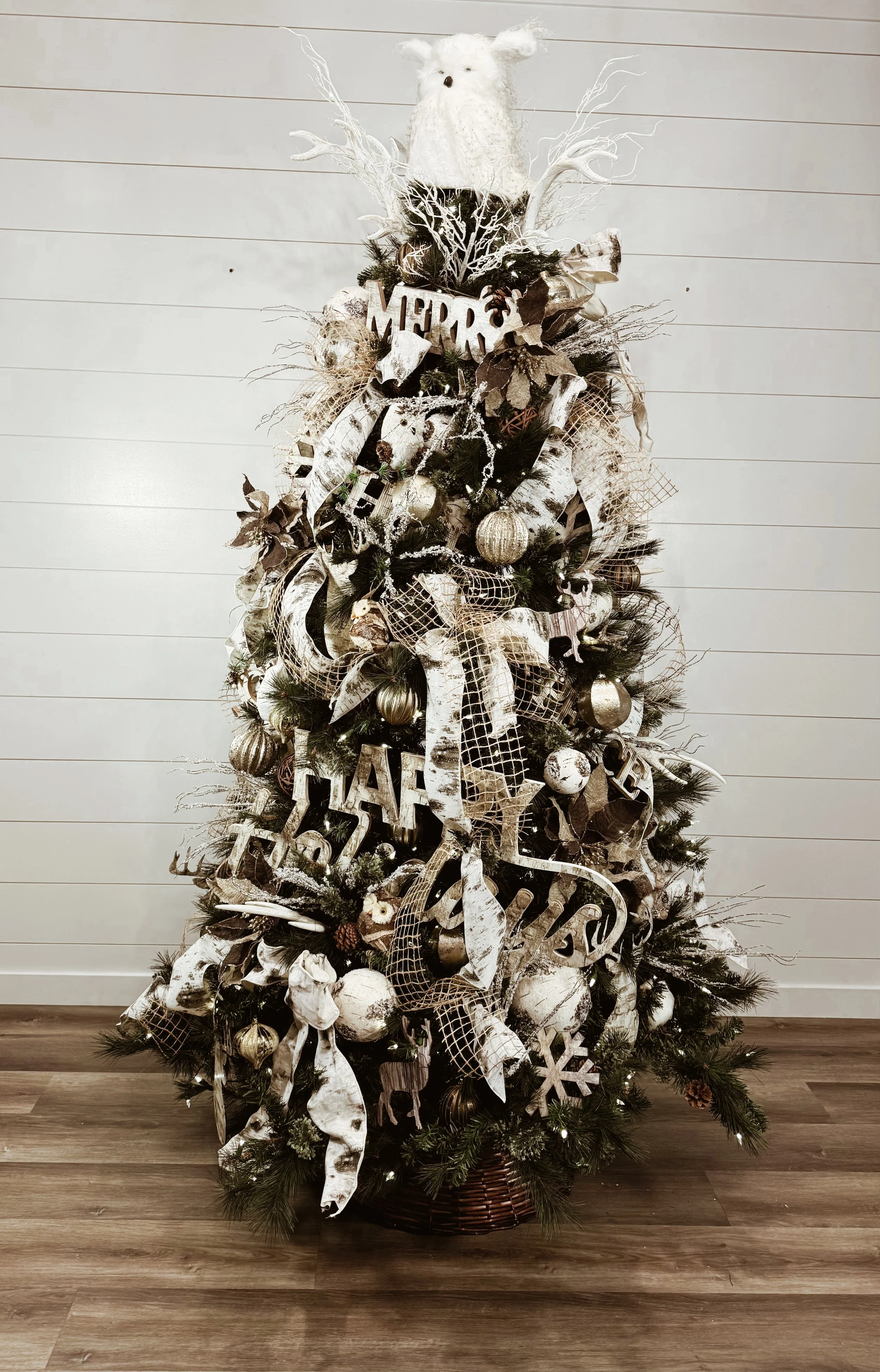 A cozy white owl perches at the top, watching over layers of rustic ornaments, antlers, pinecones, and shimmering gold accents. Every element is thoughtfully crafted to evoke the peaceful beauty of the forest from hand-carved wood details to birch-patterned loops that cascade through the tree like drifting snow.